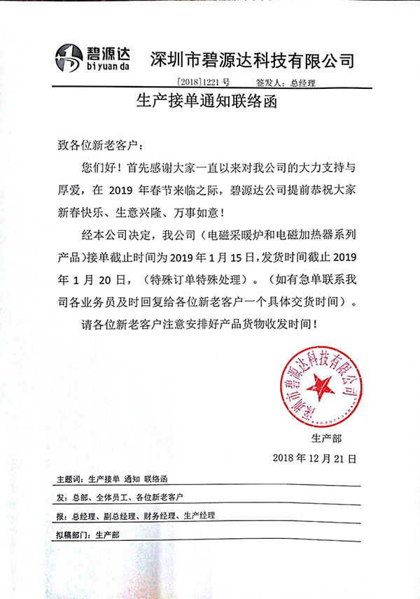 碧源達(dá)生產(chǎn)接單通知聯(lián)絡(luò)函