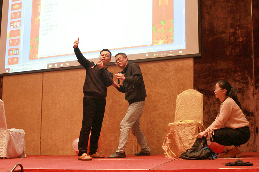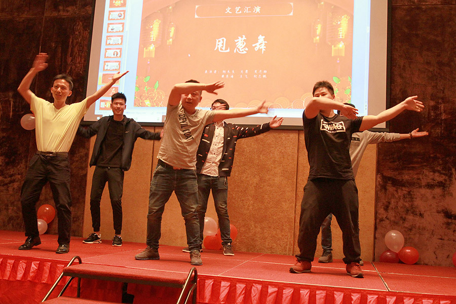 令人期待的由副總李友琦主演的小品《演習(xí)》,緊張上演了。其它部門(mén)的同事們隨后拿出了各自的十八般武藝。這不,生產(chǎn)部的一群‘糙漢子’,居然跳起了《甩蔥舞》,畫(huà)面太美,原諒小編就不插播視頻了。