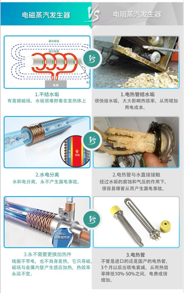 2. 電磁蒸氣發(fā)生器水電分離,永不產(chǎn)生漏電事故。而電阻蒸汽發(fā)生器電熱管直接與水接觸,經(jīng)過(guò)水垢的腐蝕和氣壓的作用下,很容易爆管,從而產(chǎn)生漏電事故。