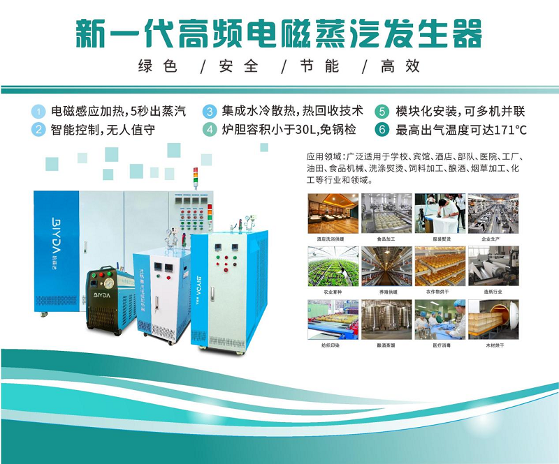 碧源達電磁蒸汽發(fā)生器:主要采用電磁感應加熱方式,從結構上設計,是免檢型蒸汽發(fā)生器,完全自動補水、自動加熱,同時可連續(xù)產生壓蒸汽,功率段有單相2kW、3.5kW、5kW、6kW、8kW;三相10kW、12kW、15kW、20kW、30kW、40kW、50kW、60kW、80kW系列;更有大功率120-360kW系列。安裝時,極為簡便。無需專用電工,只要接通水源和電源即可出汽。汽壓可以0-0.7MPa之間可以隨調整,傻瓜式操作。